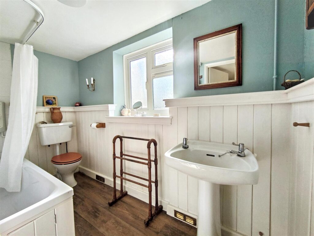 Double glazed window with obscured glass to rear aspect, fitted with a three piece suite comprising bath with electric shower over, WC, pedestal wash hand basin, electric storage heater, vinyl flooring, wood pannelling.