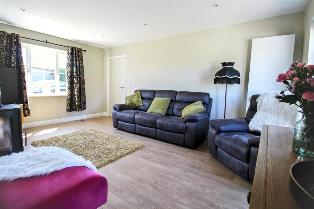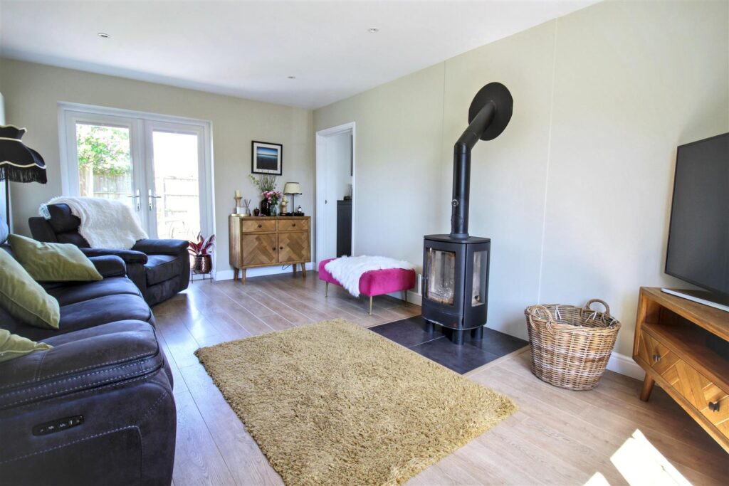 A dual aspect room with double glazed French doors to rear garden and window to front, laminate flooring, wood burning stove with tiled hearth, radiator.