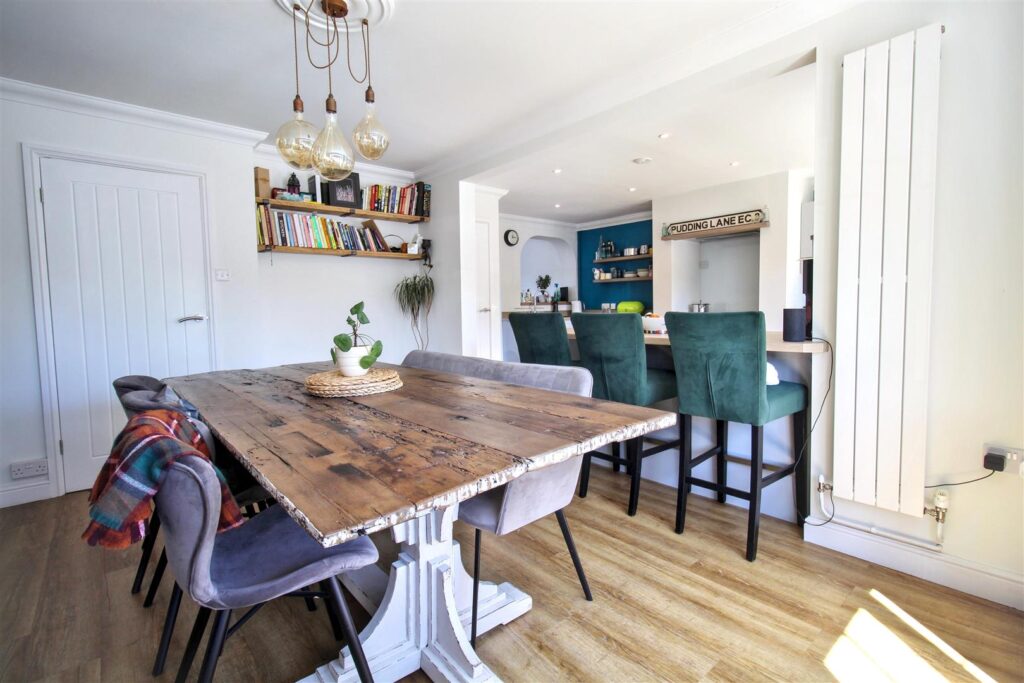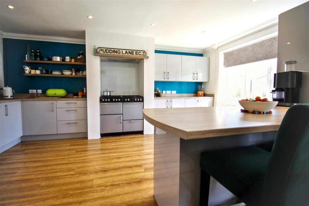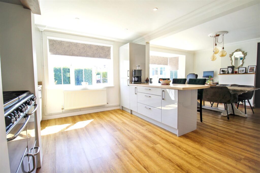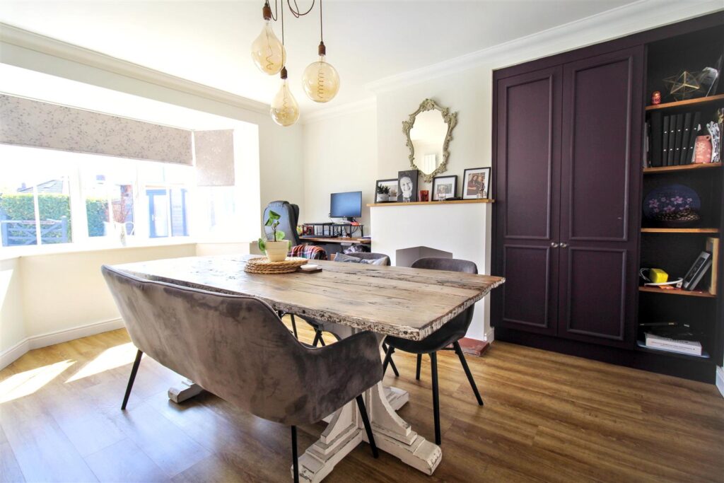 A dual aspect room with double glazed window to front and rear aspect, fitted with wall and base units with integrated fridge/freezer and dishwasher, space for double gas oven with 8 ring gas hob and cooker hood over, built in storage cupboard, laminate flooring, radiator. Open to:- dining area with double glazed bay window to front aspect, laminate flooring.