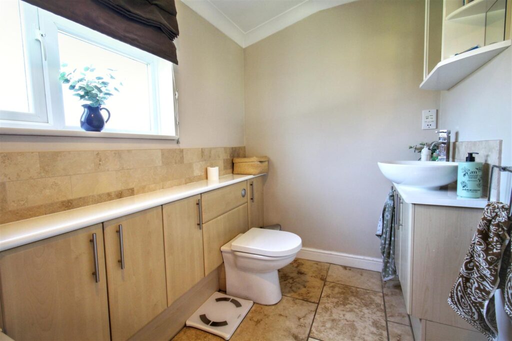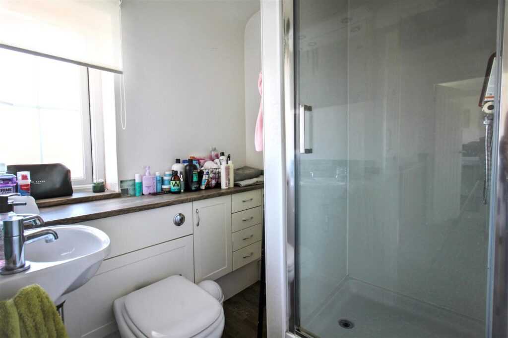Double glazed window with obscured glass to rear aspect, shower cubicle with mains connected shower, vanity unit with WC, wash hand basin, vinyl flooring, heated towel rail.