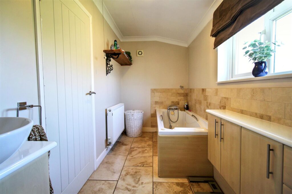 Double glazed window with obscured glass to rear aspect, bath with mixer tap and shower head attachment, vanity unit with WC, vanity unit with inset wash hand basin, tiled flooring, extractor fan, radiator.