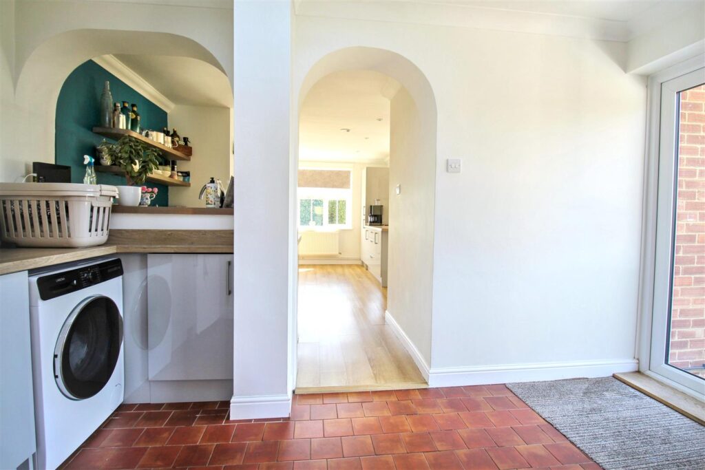 Double glazed French doors to garden and Velux window, base units with space and plumbing for washing machine, under counter fridge, tiled flooring, radiator, archway to:-