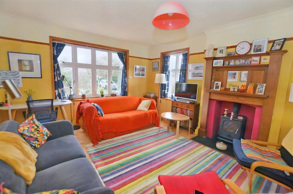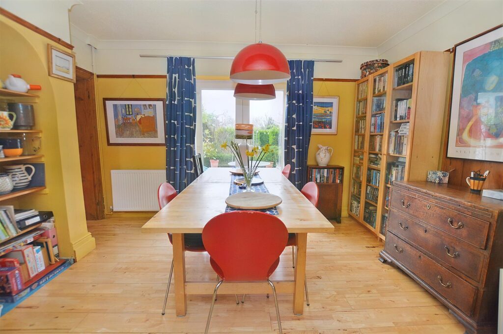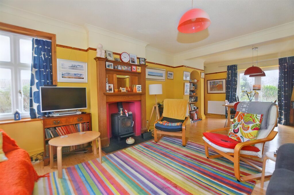 Another light room with three aspects to front, side and rear. Polished wood floor, full height wooden fire surround with wood burning stove in recess on stone hearth, radiator, TV point. Open plan design to include the dining area with a further radiator, shelved arched recess, door leading to: