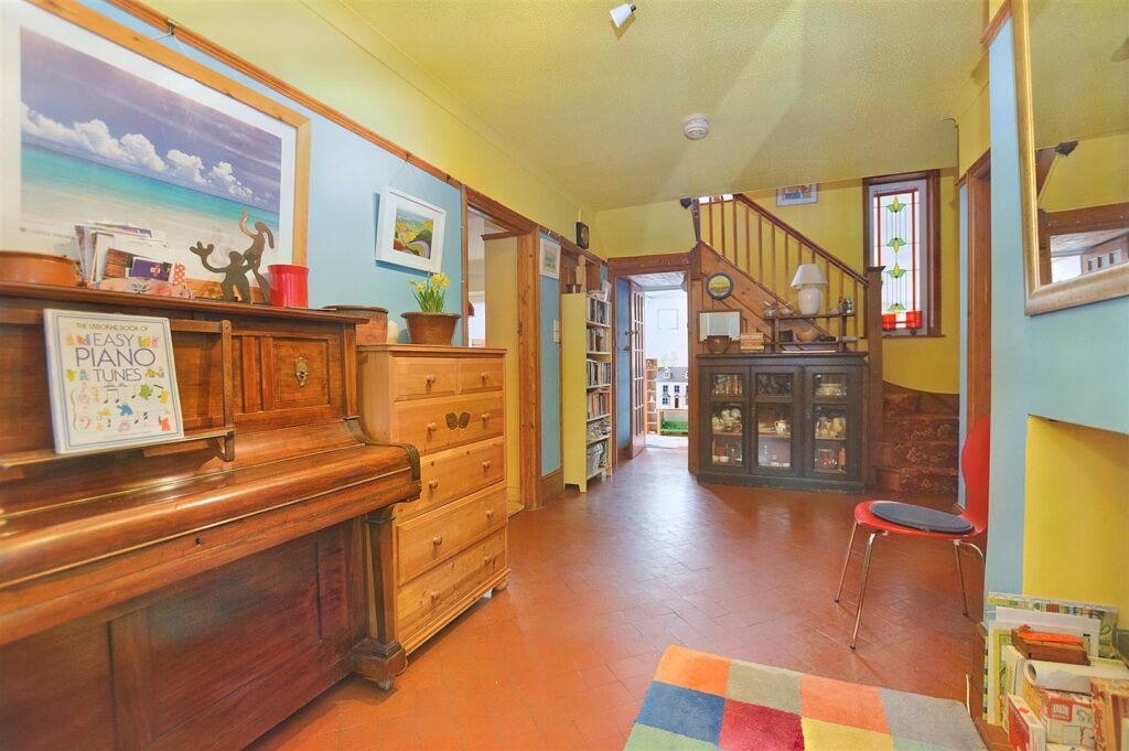 Original polished tiled floor, fireplace recess with original tiled hearth, turning staircase to first floor.