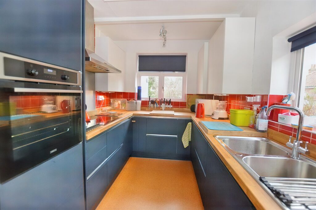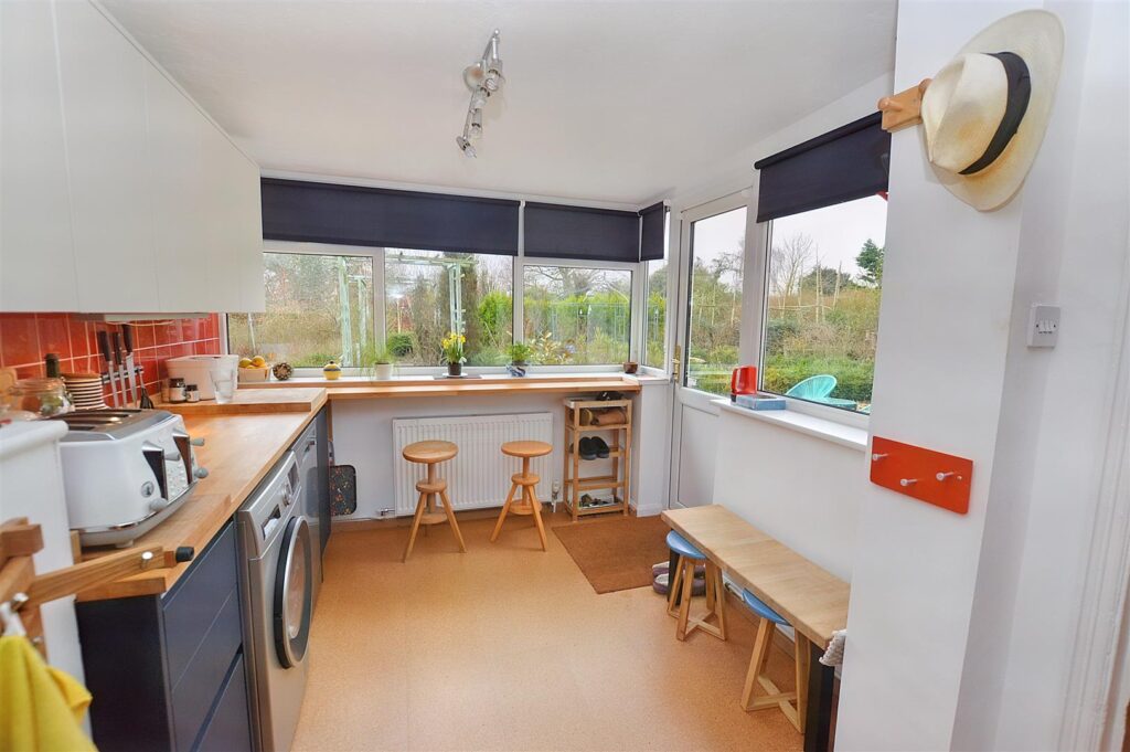 The kitchen area with windows to the front and side, has recently been re-fitted with a contemporary range of base and wall units with solid wood work surfaces and tiled splash backs. Inset double bowl stainless steel sink unit. Inset electric hob with built in oven and extractor hood above. Space for fridge/freezer. The breakfast area has a continuation of the units and work surfaces with provision for a washing machine and dishwasher, radiator. The breakfast bar enjoys a lovely south facing view over the rear garden from the windows and part glazed door.