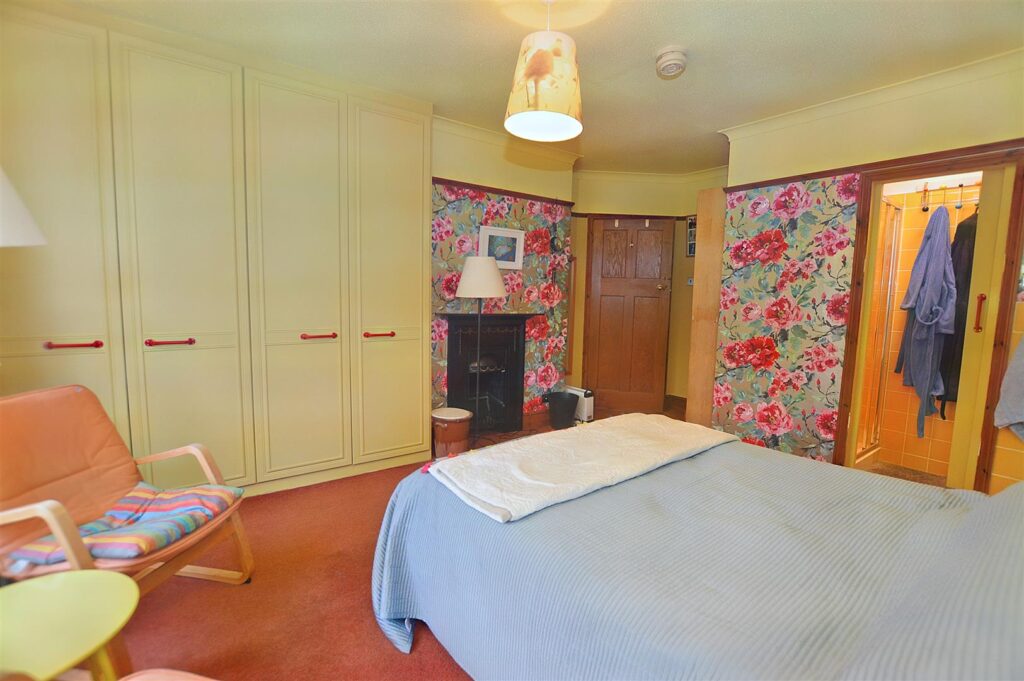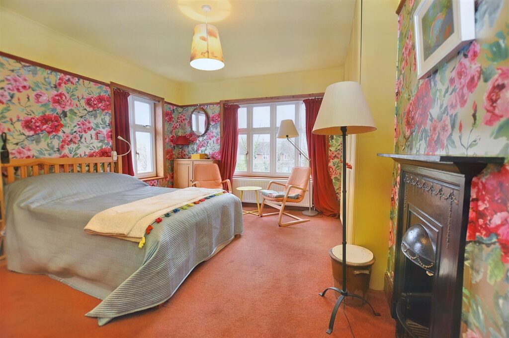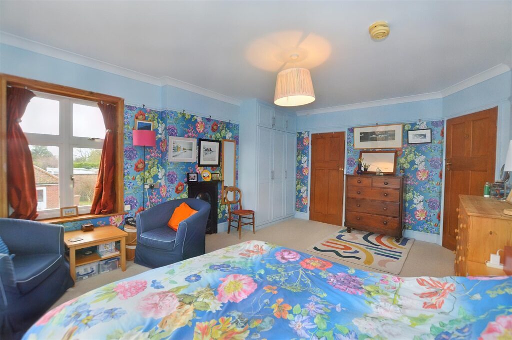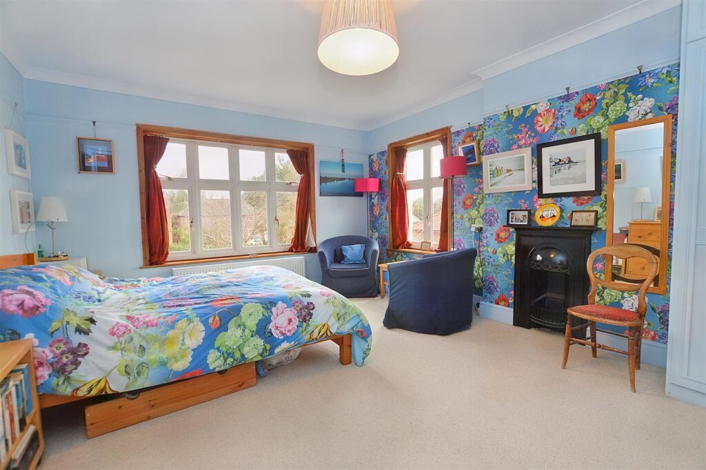 Another light room with dual aspect windows, radiator, period fireplace, triple fitted wardrobe cupboard. Door to: