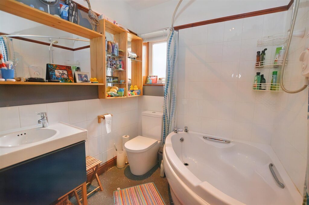 Corner bath with electric shower above and tiled splash backs, vanity washbasin with cupboards beneath, close coupled w.c., wall tiling, window to rear aspect.