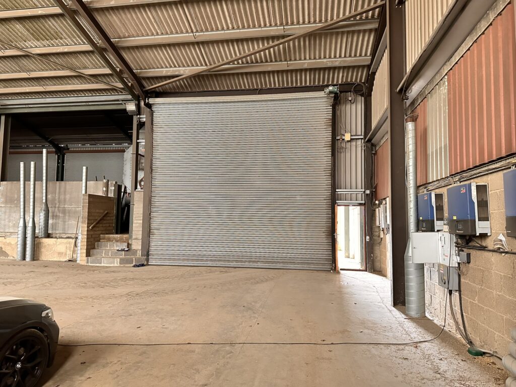 The unit is of steel portal frame construction with part block and part profile steel clad elevations under a pitched roof with PV solar panels on both pitches.