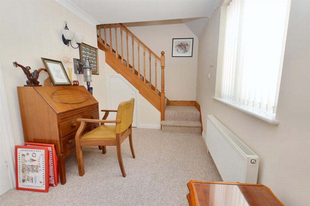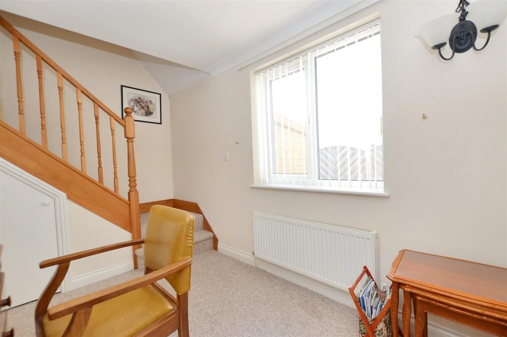 With window to rear aspect, radiator, turning staircase to first floor with understairs storage cupboard, door to hallway.