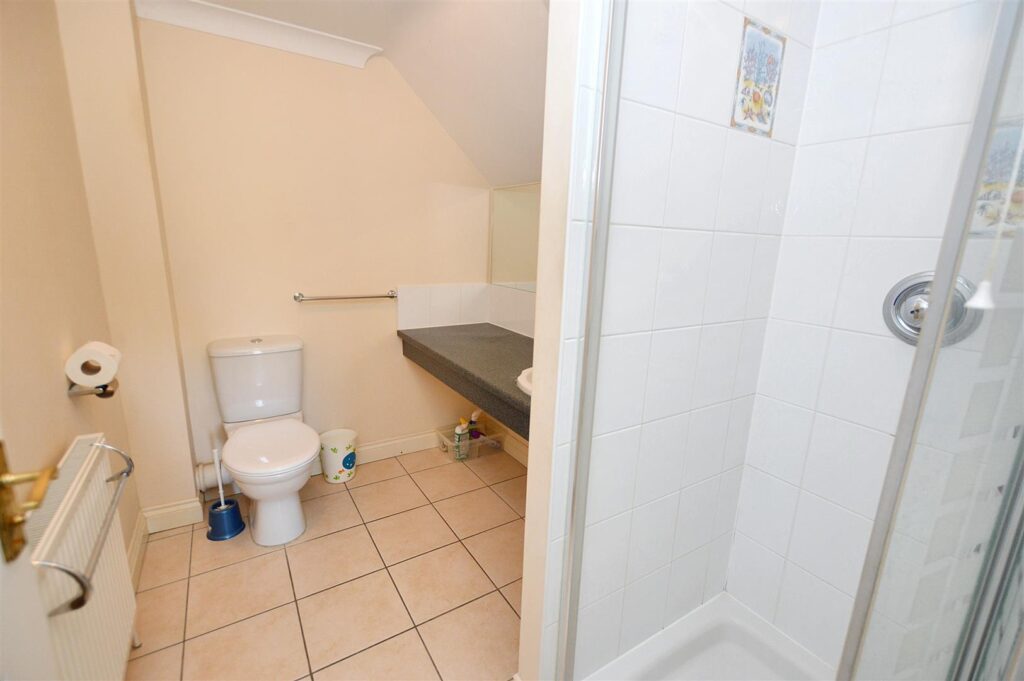 Enclosed shower cubicle with folding glazed screen, vanity wash basin with wall mirror, electric shaver light and point, close coupled w.c., radiator, tiled floor.