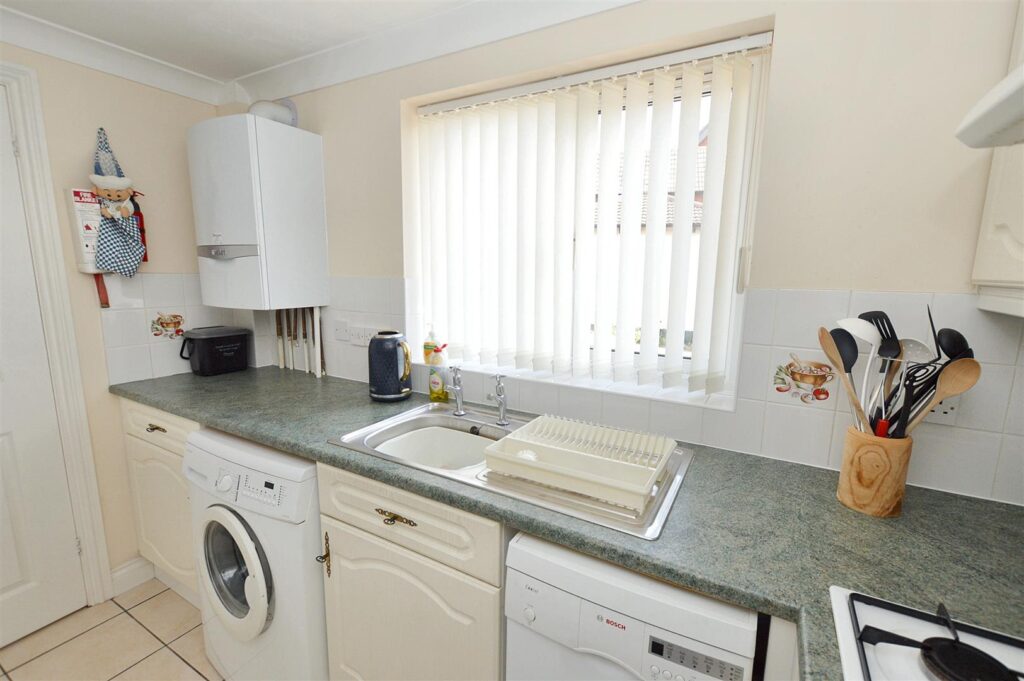 Nicely fitted with a comprehensive range of white base and wall storage cabinets with laminated work surfaces and tiled splashbacks, inset gas hob unit with filter hood above, integrated electric double oven, space for refrigerator, provision for dishwasher and washing machine, wall mounted gas fired boiler providing central heating and domestic hot water, tiled floor, window to front aspect.