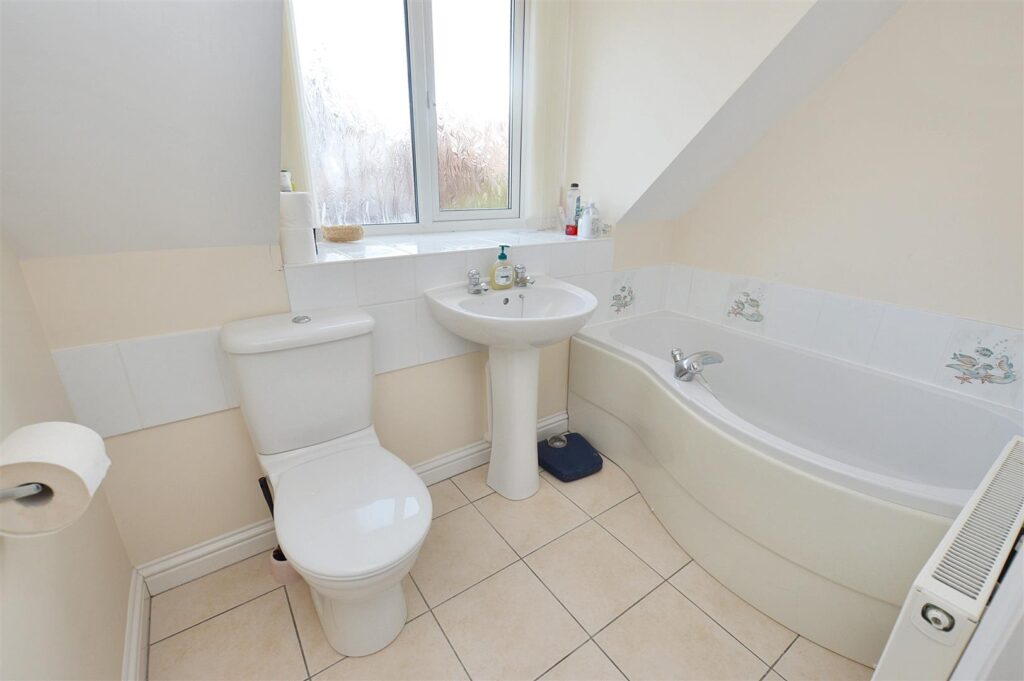 Panelled bath, pedestal wash basin, close coupled w.c., tiled floor, radiator, obscure window to front aspect. Wall mirror with electric shave point and light.