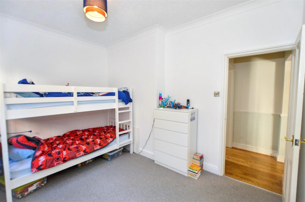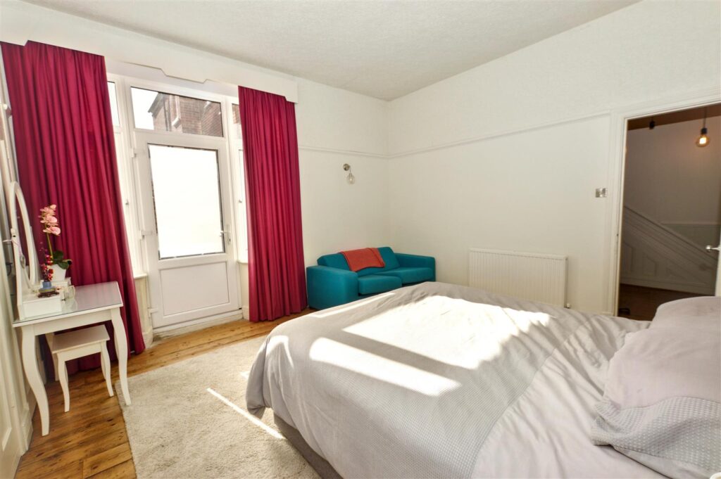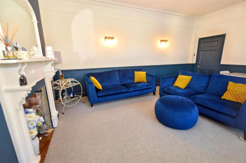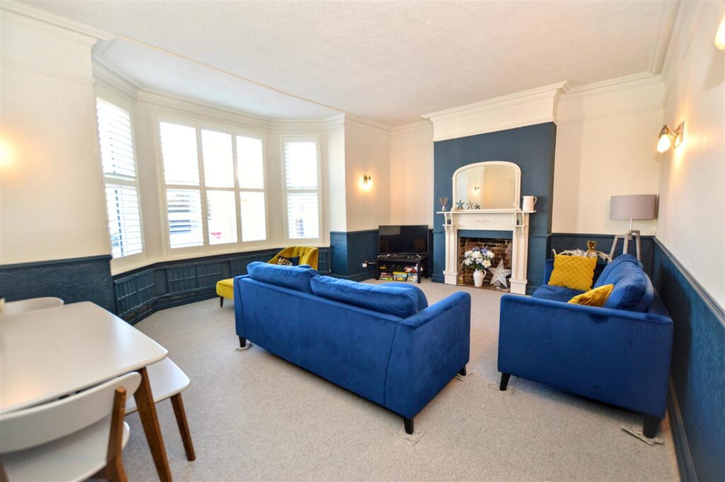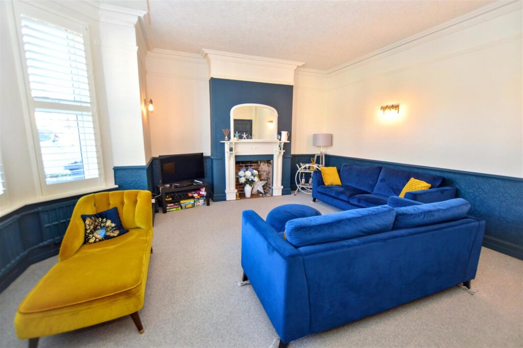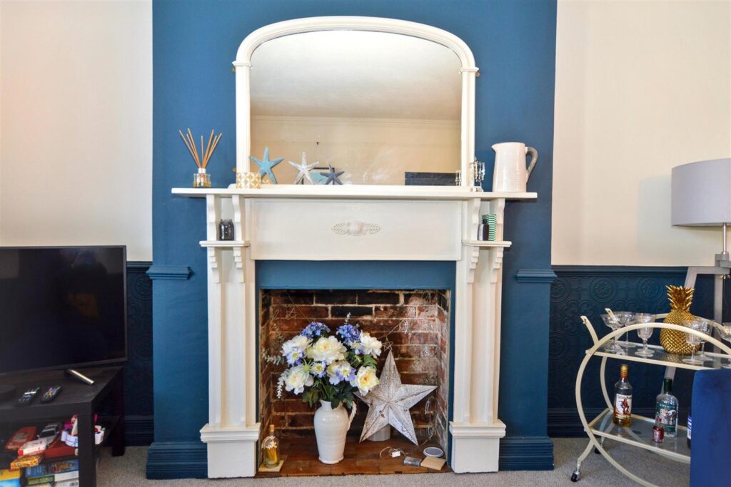A beautifully proportioned room with wide bay window to the front aspect with fitted wooden blinds, period fire surround with open fire recess, two radiators, provision for TV, 4 wall light points.
