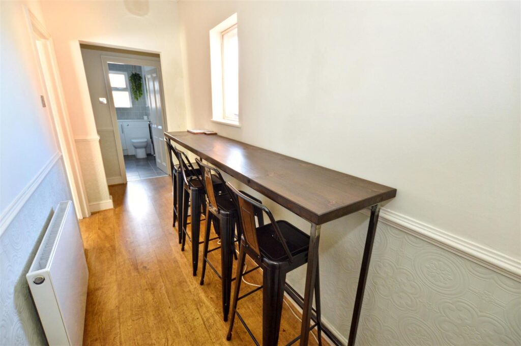 Glass panelled entrance door, wood laminate flooring, radiator, two built in storage cupboards, one cupboard housing pressurised water cylinder with immersion heater.