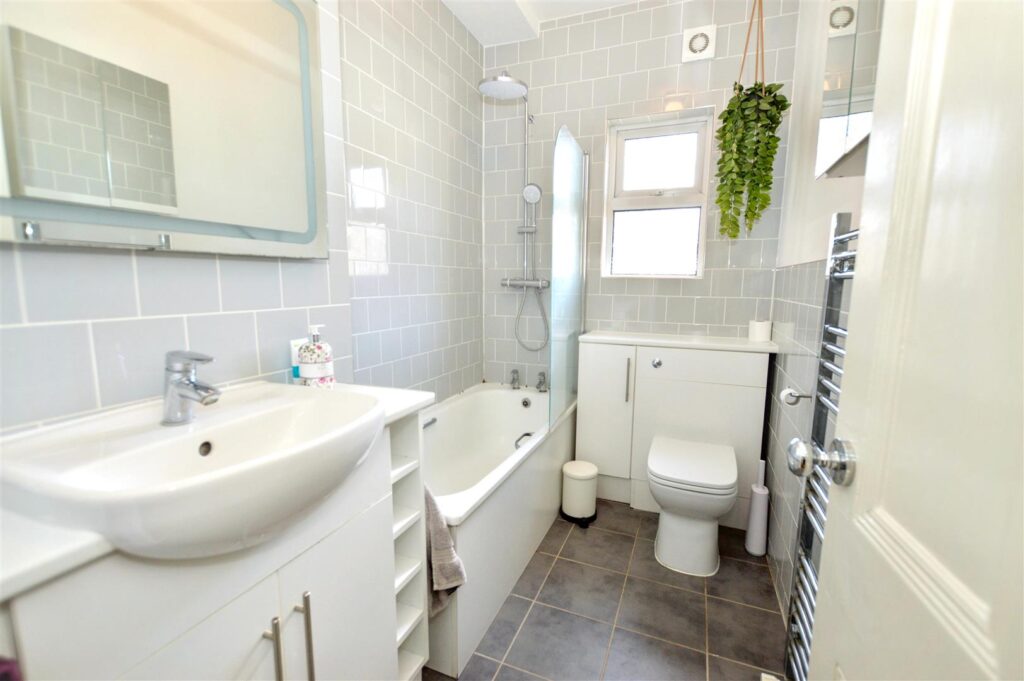 Panelled bath with mixer shower and glass shower screen, concealed cistern w.c., vanity wash basin with cupboards beneath, illuminated mirror, metro tiling to walls, chrome heated towel rail.