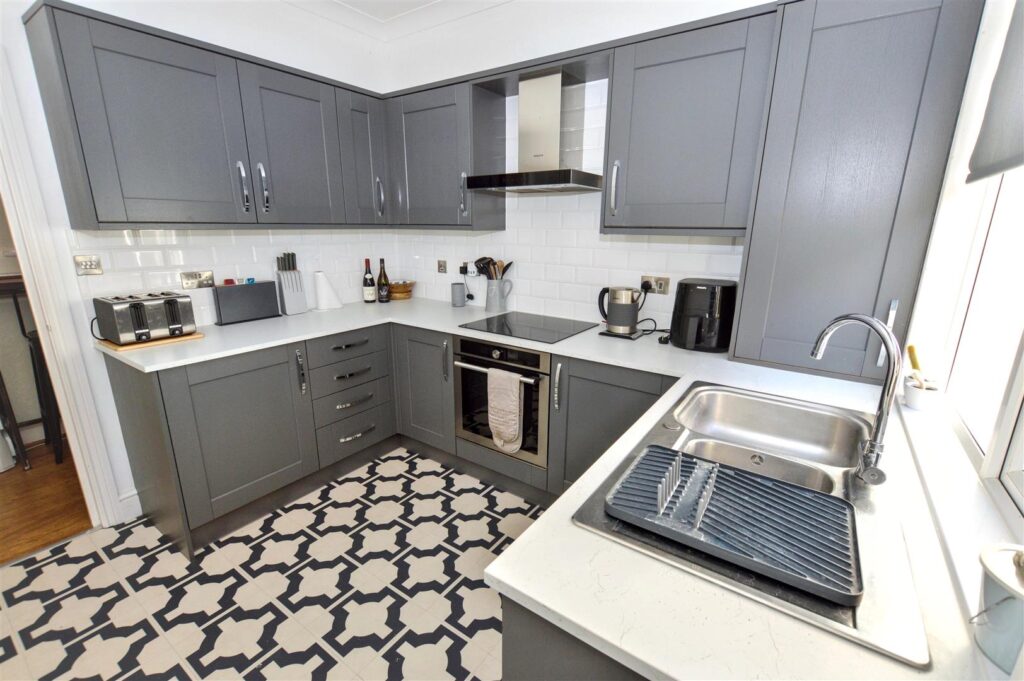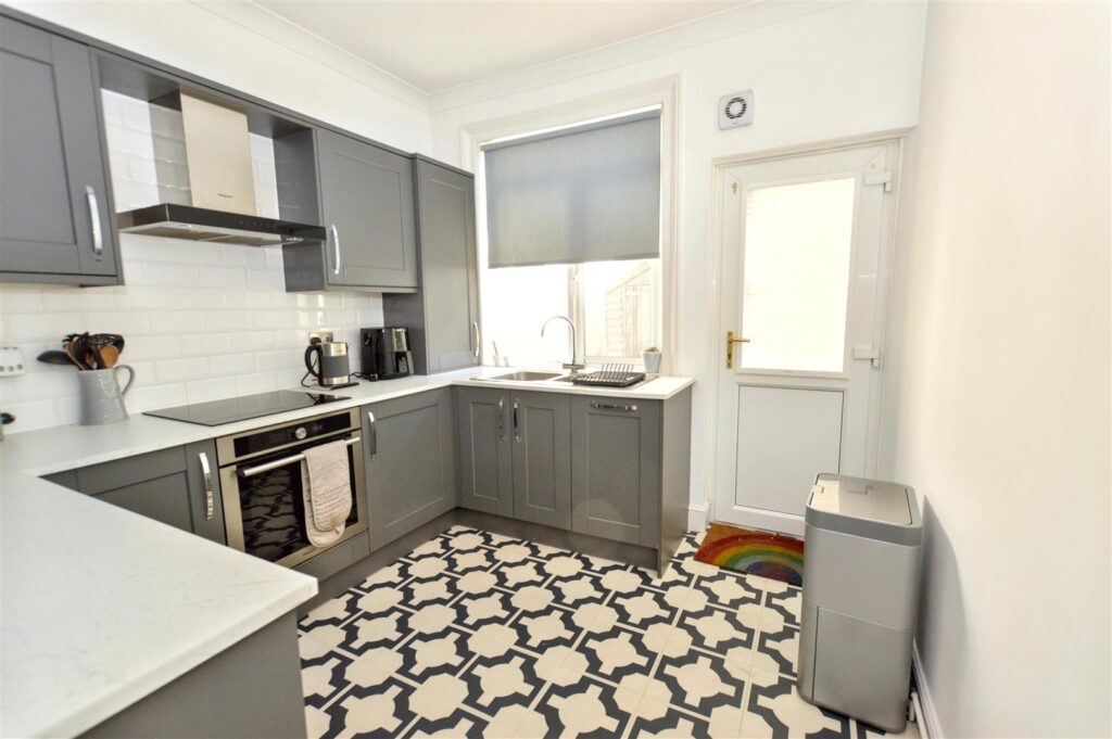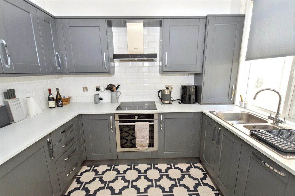 A contemporary range of shaker style base and wall cabinets with laminated work surfaces and tiled splashbacks, inset electric hob with oven beneath and filter hood above, inset stainless steel sink unit, integrated dishwasher, integrated refrigerator, vertical radiator, part glazed door and window to rear aspect, extractor fan.