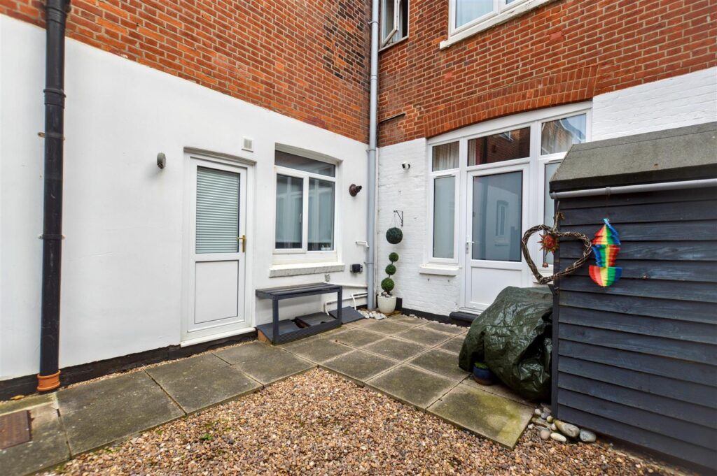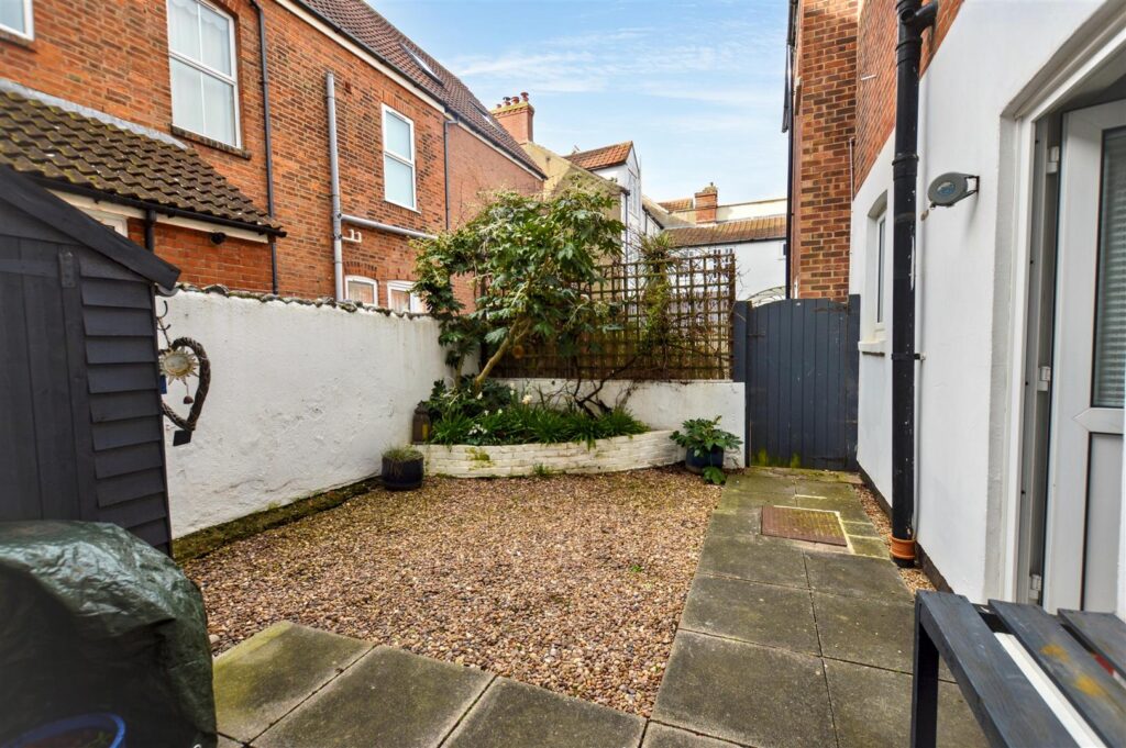 West facing courtyard with paving and shingled area, raised flower bed and timber GARDEN SHED. Pedestrian access to rear.
