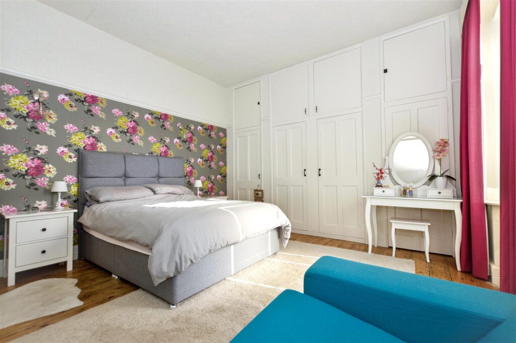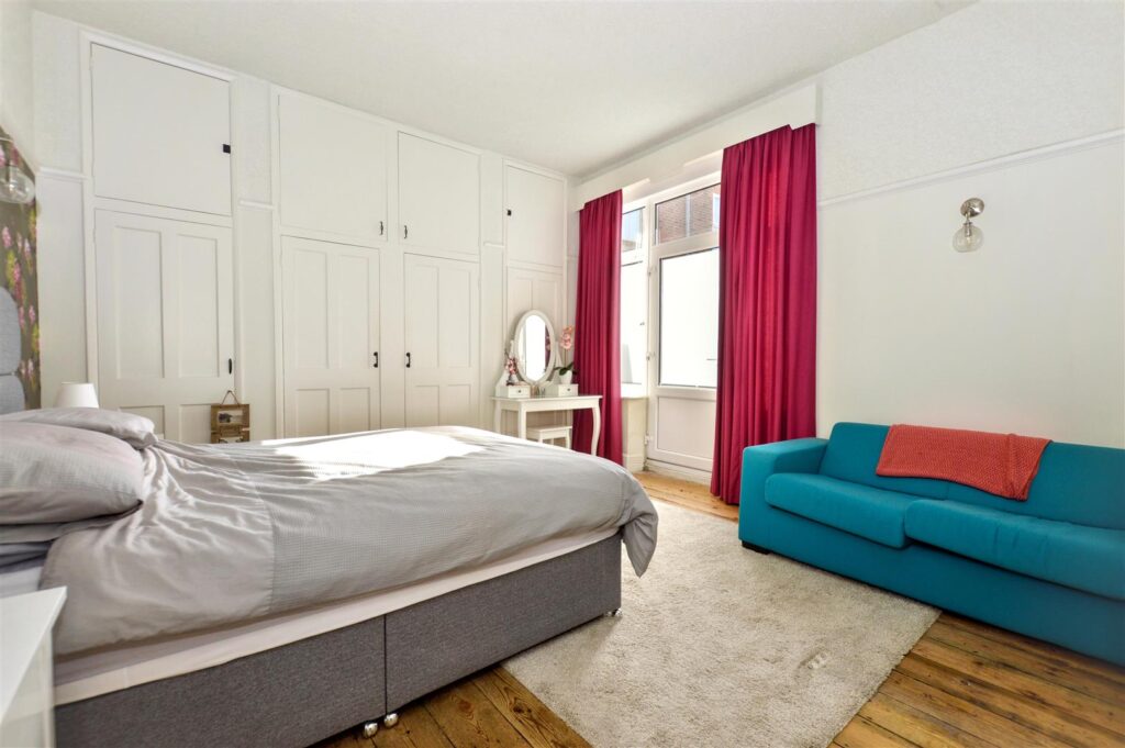 A light room with glazed casement door and windows to west facing aspect, polished wood floor, range of fitted wardrobe cupboards with store cupboards above, radiator.